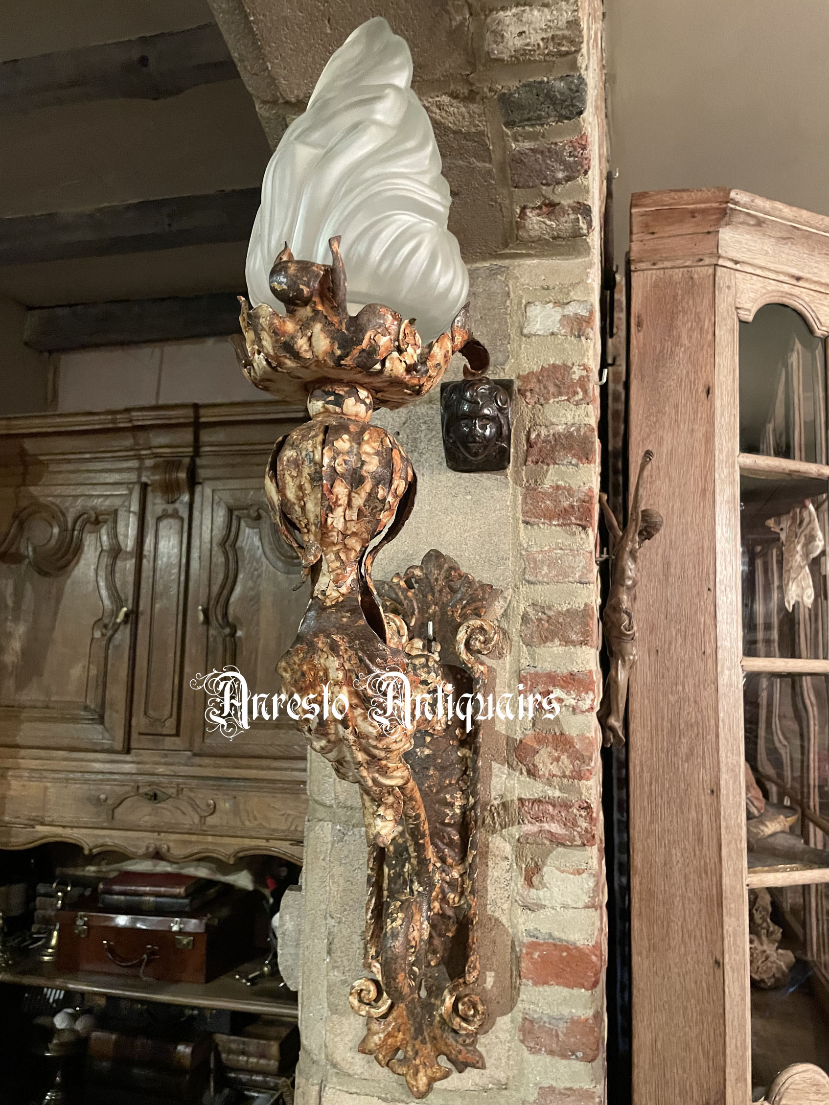48. Antieke ijzeren muurlamp. Toortsmodel. Art nouveau stijl. 19de eeuw, +/- 1880. Herkomst Brussel. Afmetingen: hoogte: 65 cm / diepte: 40 cm. Antieke smeedijzeren wandlamp pinterest. Antique wrought iron wall lamp. Lampe murale antique en fer forge. Antike schmiedeeiserne Wandlampe.