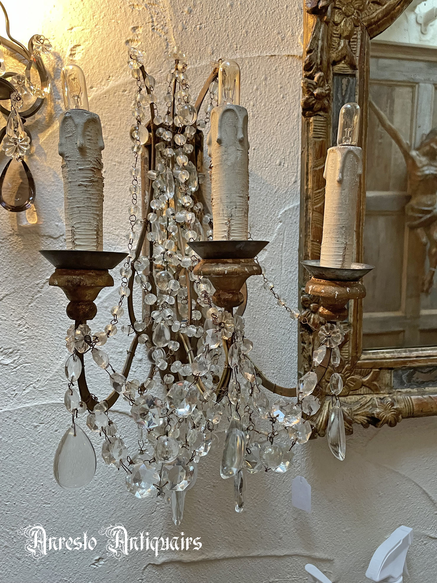 67. Antieke zeldzame Italiaanse muurlampen in Rococostijl met houten kaarsenhouders. Behangen met glazen pegels. 2 stuks voorzien van nieuwe elektra. Voorheen chandeliers. Periode +/- 1800 – 1830. Herkomst Italie. Hoogte: 40 cm / breedte: 25 cm. Antieke Italiaanse muurlampen pinterest Anresto. Antique Italian wall lamps. Lampes murales italiennes antiques. Antike italienische Wandlampen. Bezoek onze vernieuwde website