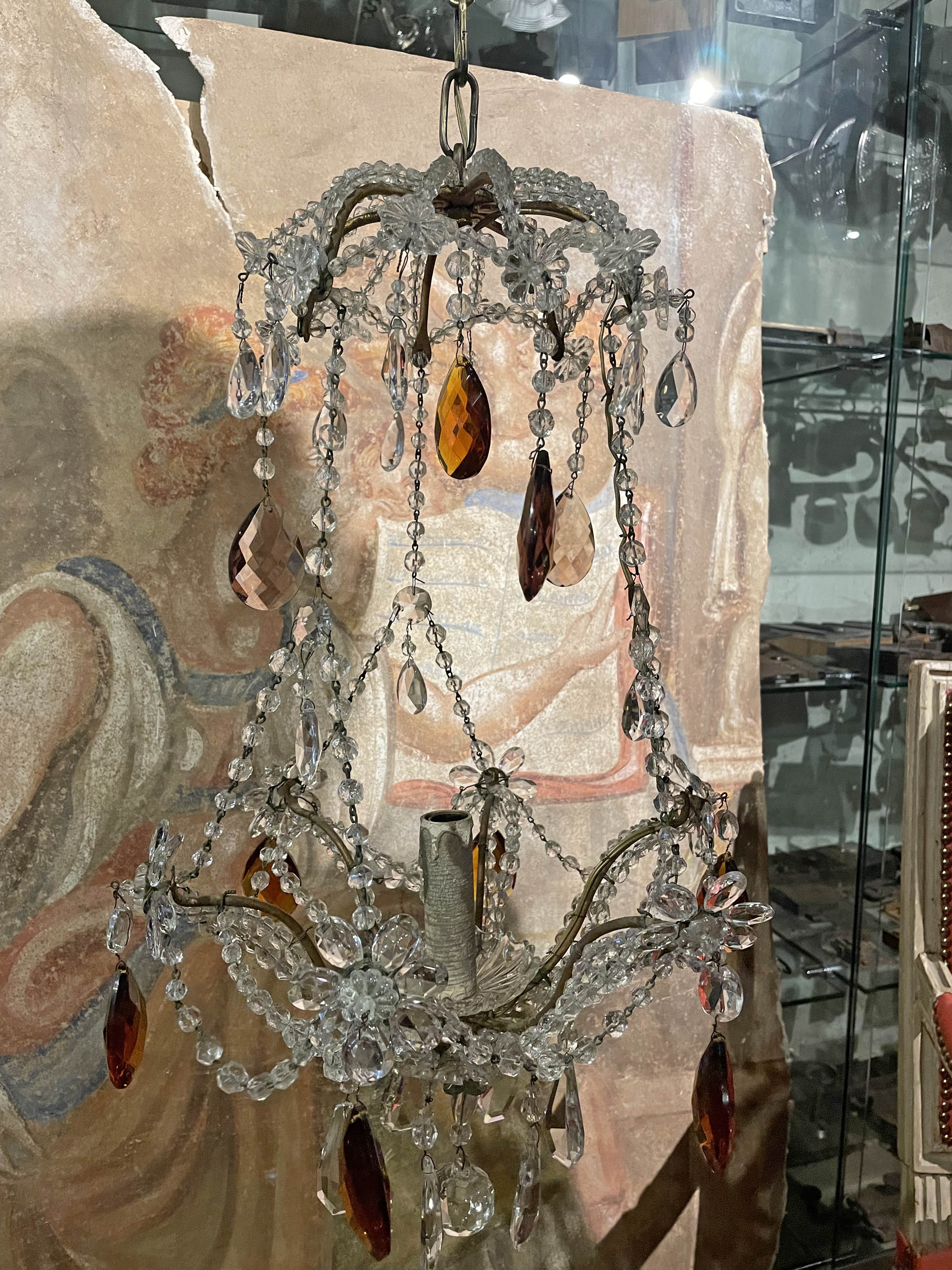 70. Antieke kroonluchter – open kroon met opgeregen glasparels en bruine geslepen kristallen pegels. Periode 1900. Italiaanse herkomst. Hoogte: 55cm / breedte: 35cm. Antieke Italiaanse luster pinterest Anresto. Antique Italian chandelier. Lustre italien antique. Antiker italienischer Leuchter. Bezoek onze vernieuwde website