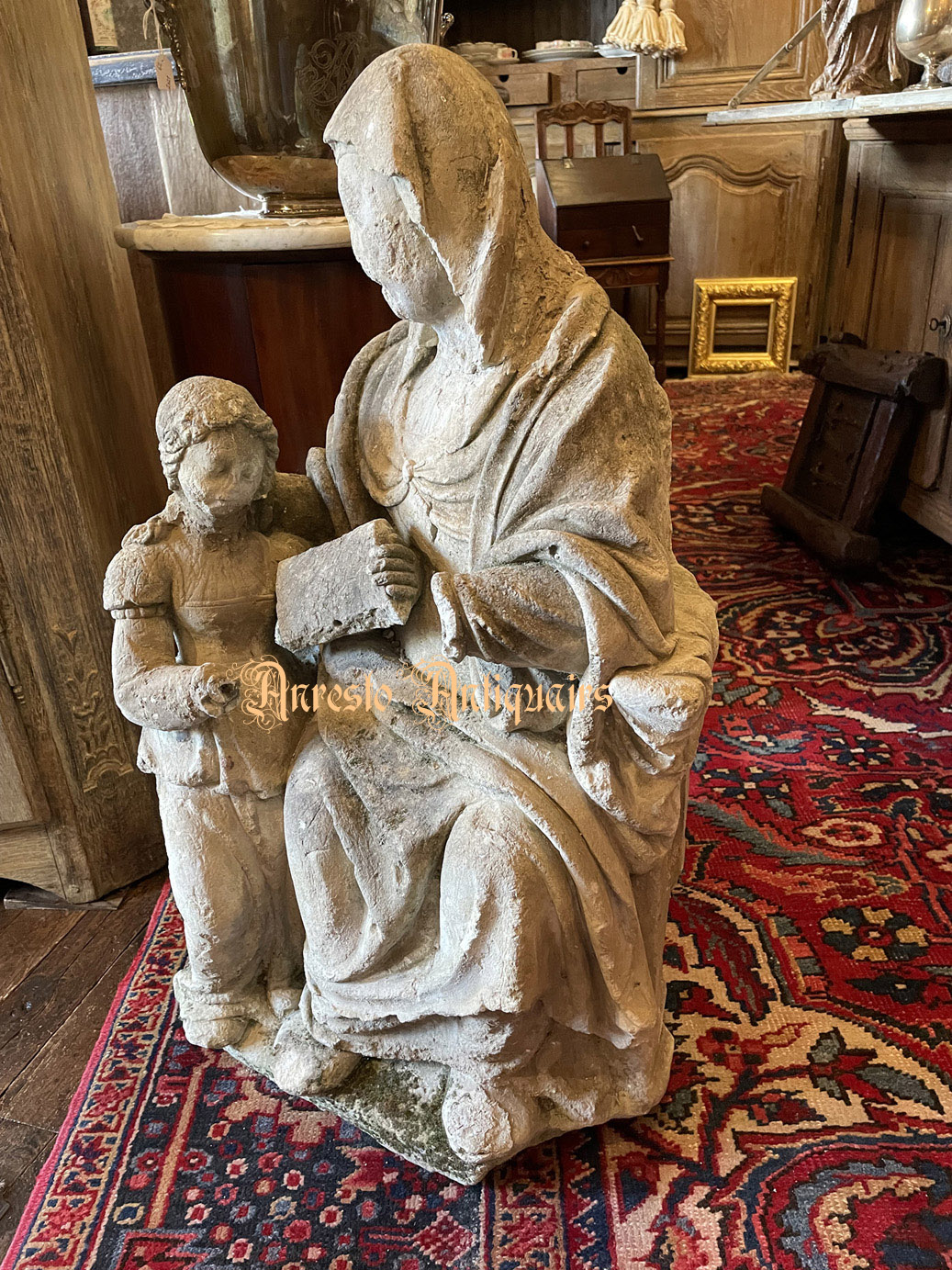 Antiek beeld handgekapt uit kalkzandsteen. Voorstelling onderwijzende Anna. 17de eeuws. Herkomst Frankrijk, Beaune streek regio Cote-d'Or. Afmetingen: hoogte: +/- 80 cm / breedte: +/- 50 cm. Antiek kalkzandstenen beeld pinterest.