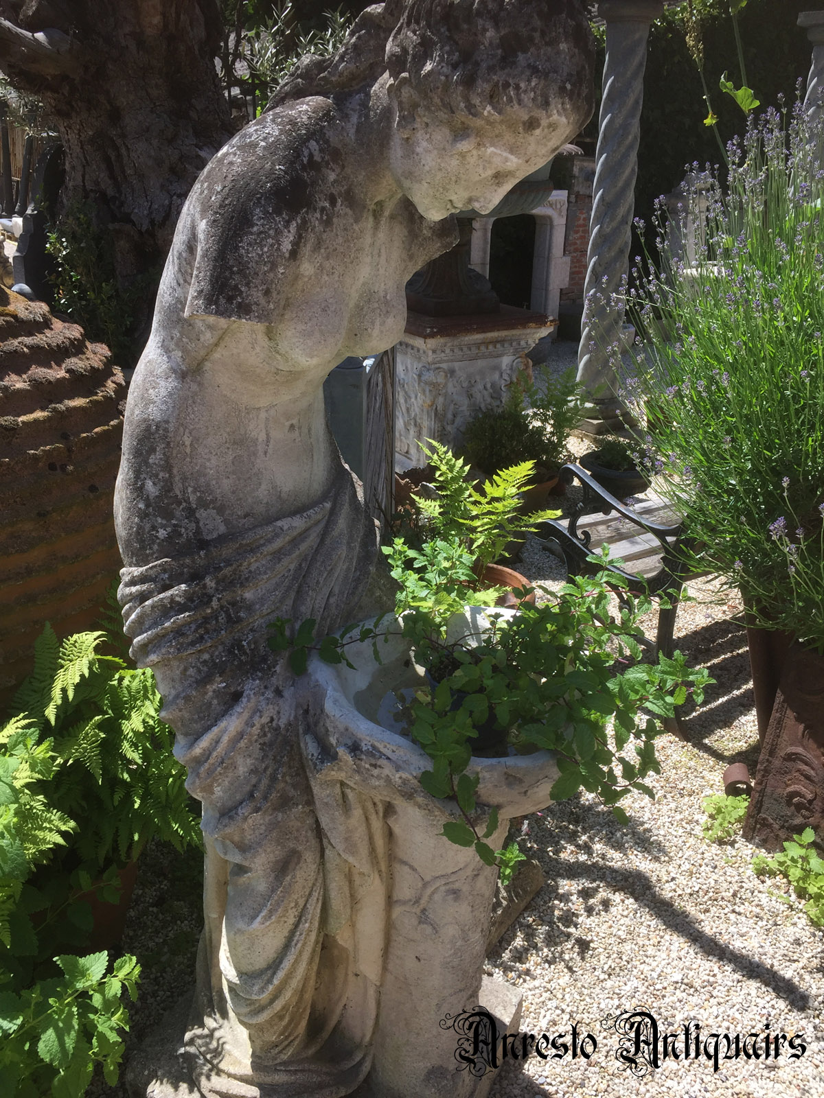 Antiek beeld, Romeinse wassende vrouw. In kalkzandsteen. 18de eeuws. Afmetingen: hoogte: 1,60 m / breedte: 44 cm.
