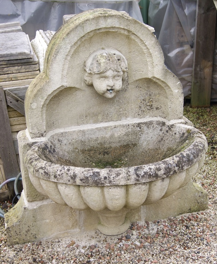 Refnr.16 BAROK FONTEIN Franse Barok Fontein. 19de eeuws in kalkzandsteen. Afmetingen: hoogte: 1,00m / breedte: 0,90m / diepte: 0,55m