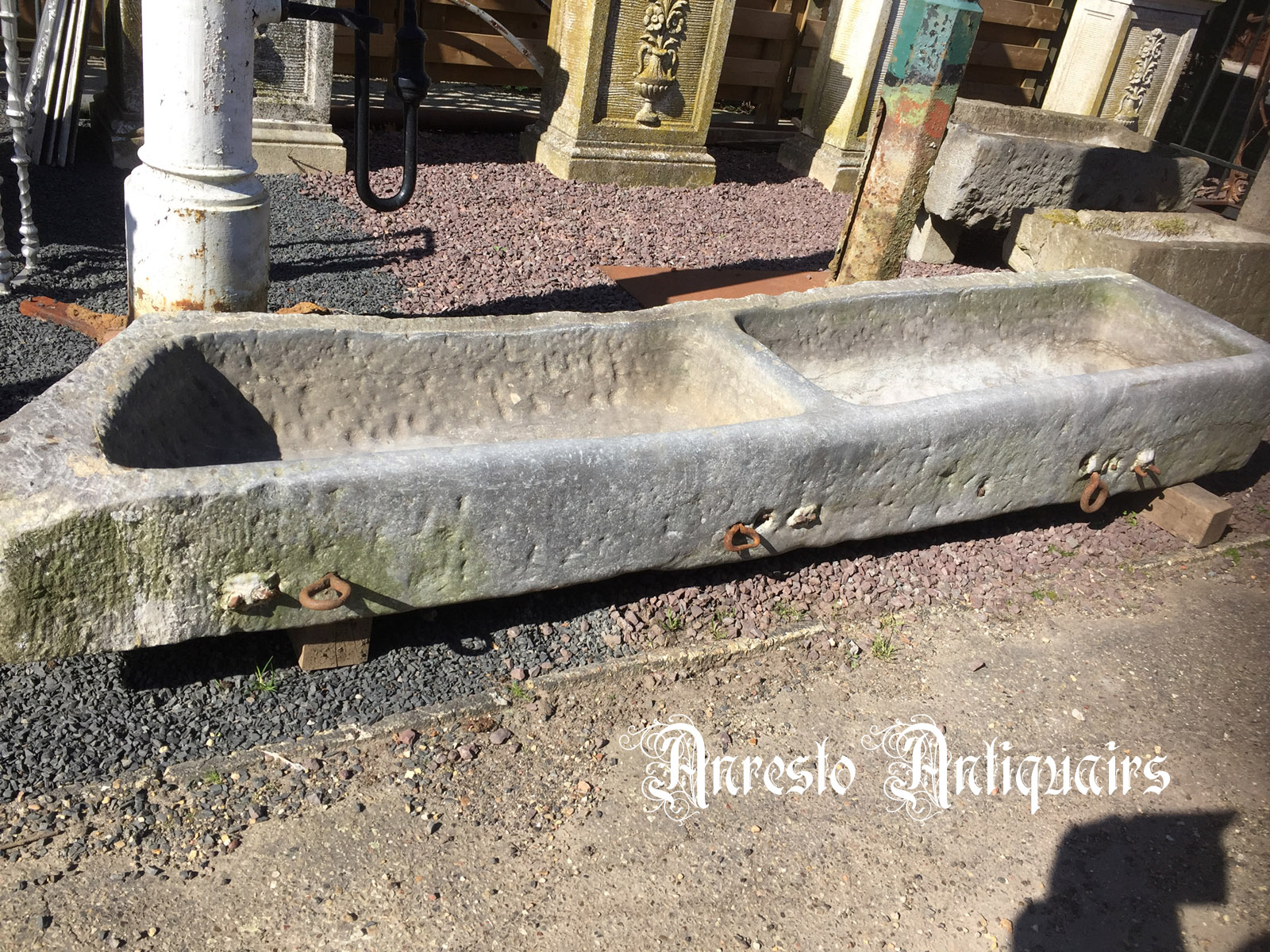 Refnr.30 Antieke blauwstenen drinkbak. Herkomst Franse Ardennen. 17de eeuw. Afmetingen: lengte: 2,30m / diepte: 50 cm / hoogte: 20 cm.
