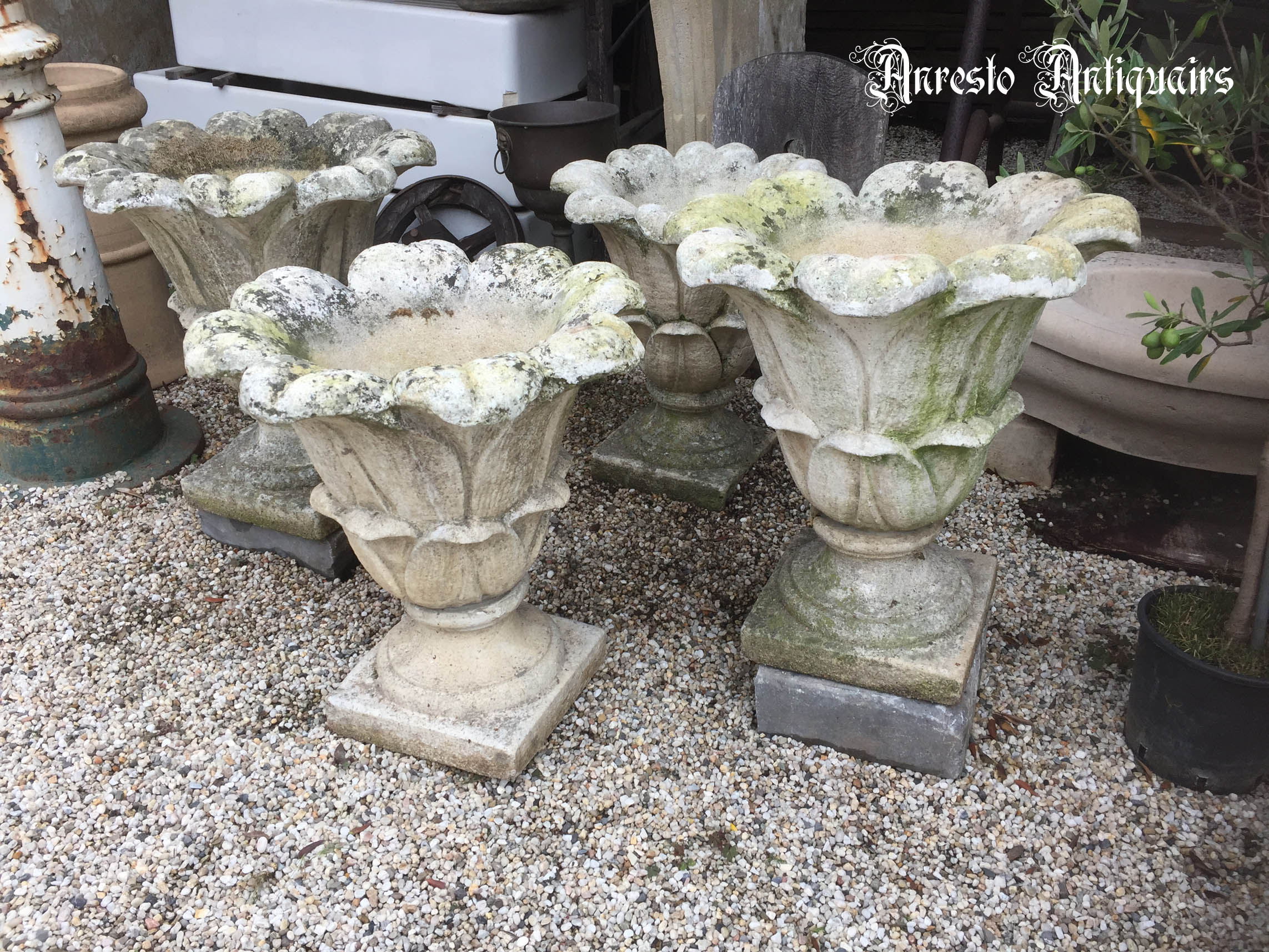 38. - Stel van 4 tuinvazen in tulpenvorm. Vervaardigd uit gemalen kalkzandsteen. Periode 1900. Afmetingen: hoogte: 52 cm / diameter boven: 47 cm.