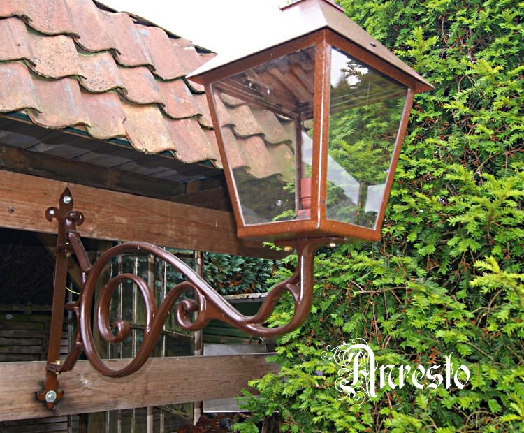 MUURLANTAARNS MET GIETIJZEREN MUURSTEUNEN Voorzien van antieke beglazing, ±1900. In perfecte staat en 3 stuks voorradig. Lengte muursteun 110cm / Hoogte incl. lampenkop 85cm