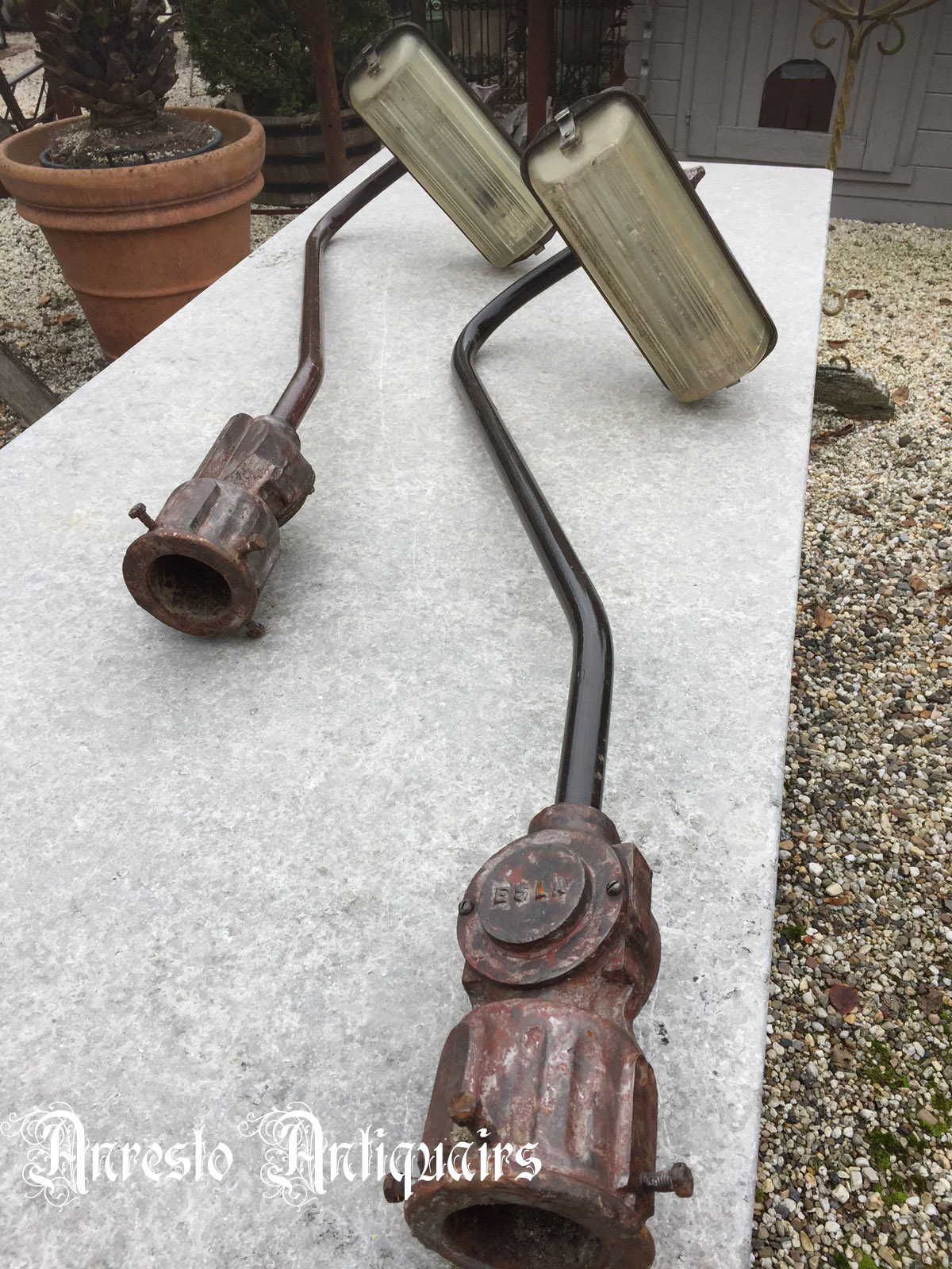 Oude industriele ijzeren tuinlampen. Gemaakt in +/- 1930 door Philips. Gesigneerd: ESLA. 2 stuks voorradig. Kan op palen of op muursteunen geplaatst worden.