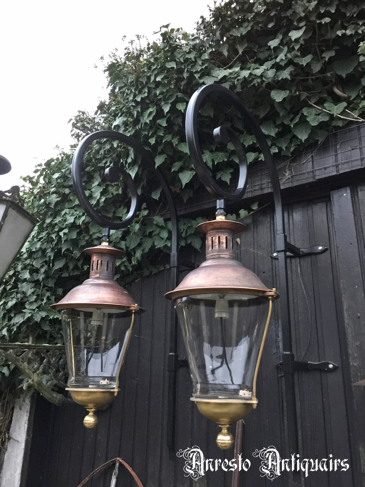 Massief koperen hanglantaarns. Massief koperen tuinhanglantaarns. Hangend aan een smeedijzeren krulboog arm. 2 stuks voorradig.