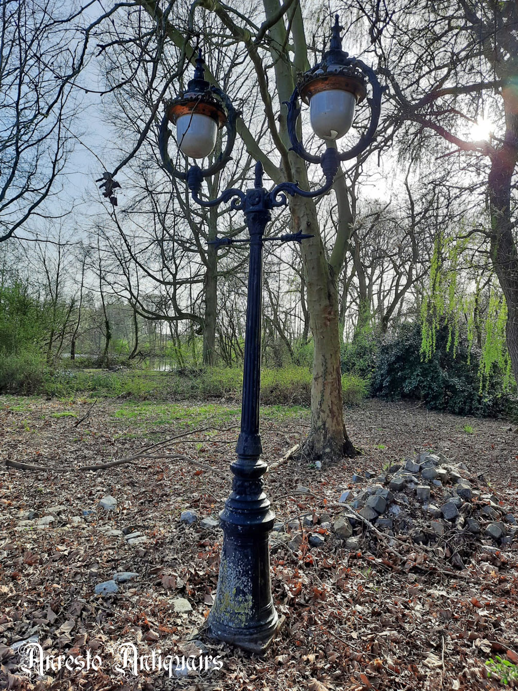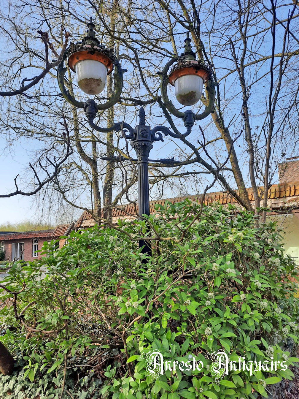 Zeldzame Oostendse lantaarnpalen met prachtige lampenkappen in massief koper. Uit 1920. 4 stuks op voorraad.