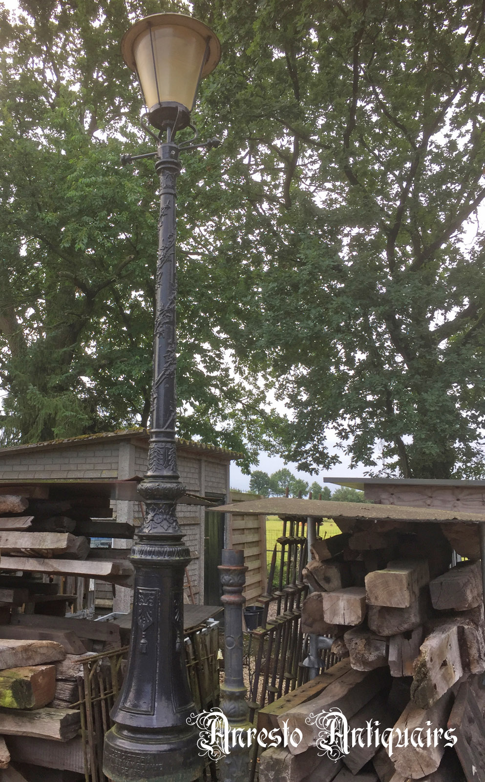 Antieke Hollandse gietijzeren lantaarnpaal. Rijkelijk versiert naar boven toe. 19de eeuws. Herkomst Den Haag. Gesigneerd: IJZERGIETERIJ DE PRINS VAN ORANJE ’S HAGE 1884