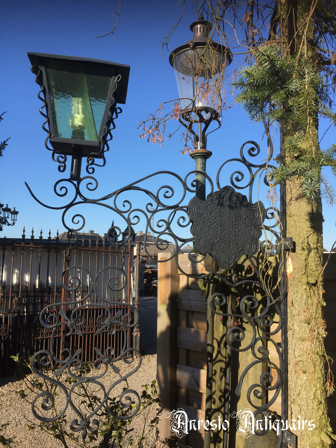 Exclusieve gesmede muursteun met buitenlantaarn met kap. Art Nouveau stijl. Periode +/- 1910. Afmetingen: lengte vanuit de muur: 85 cm / totale hoogte: 1,35 m.