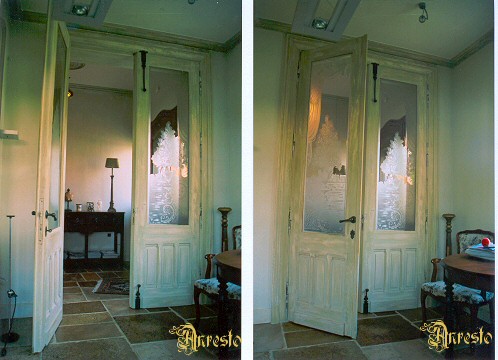 ART NOUVEAU BINNENDEUREN Binnendeuren, Art Nouveau met geetste beglazing, wordt in oude kalkverf met doorschuurtechniek afgewerkt. Bijpassend hang- en sluitwerk. U kunt tevens voor deskundige plaatsing van uw antieke binnendeuren op Anresto vertrouwen.