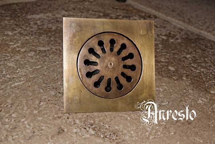 14. DOUCHE AFVOERPUTJE Douche afvoerputje. In massief koper, messing. Afwerking in kleur naar keuze. Op maat verkrijgbaar. Afmetingen: Lengte x breedte: 13 x 13 cm.